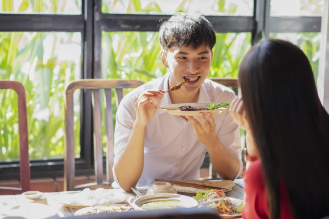 ○食事をしながら、ゆっくり、じっくり話せる少人数制の婚活食事会です。